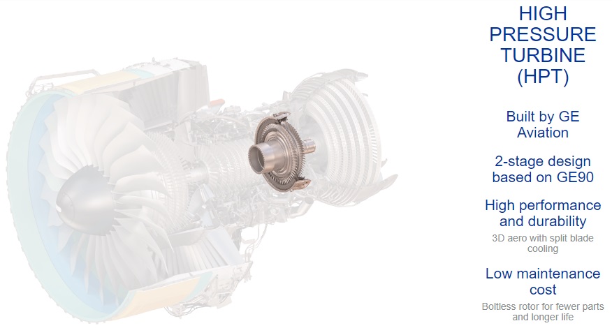 - Turbine : single stage HP turbine (HPT), single stage IP turbine (IPT), 5-stage LP turbine (LPT)