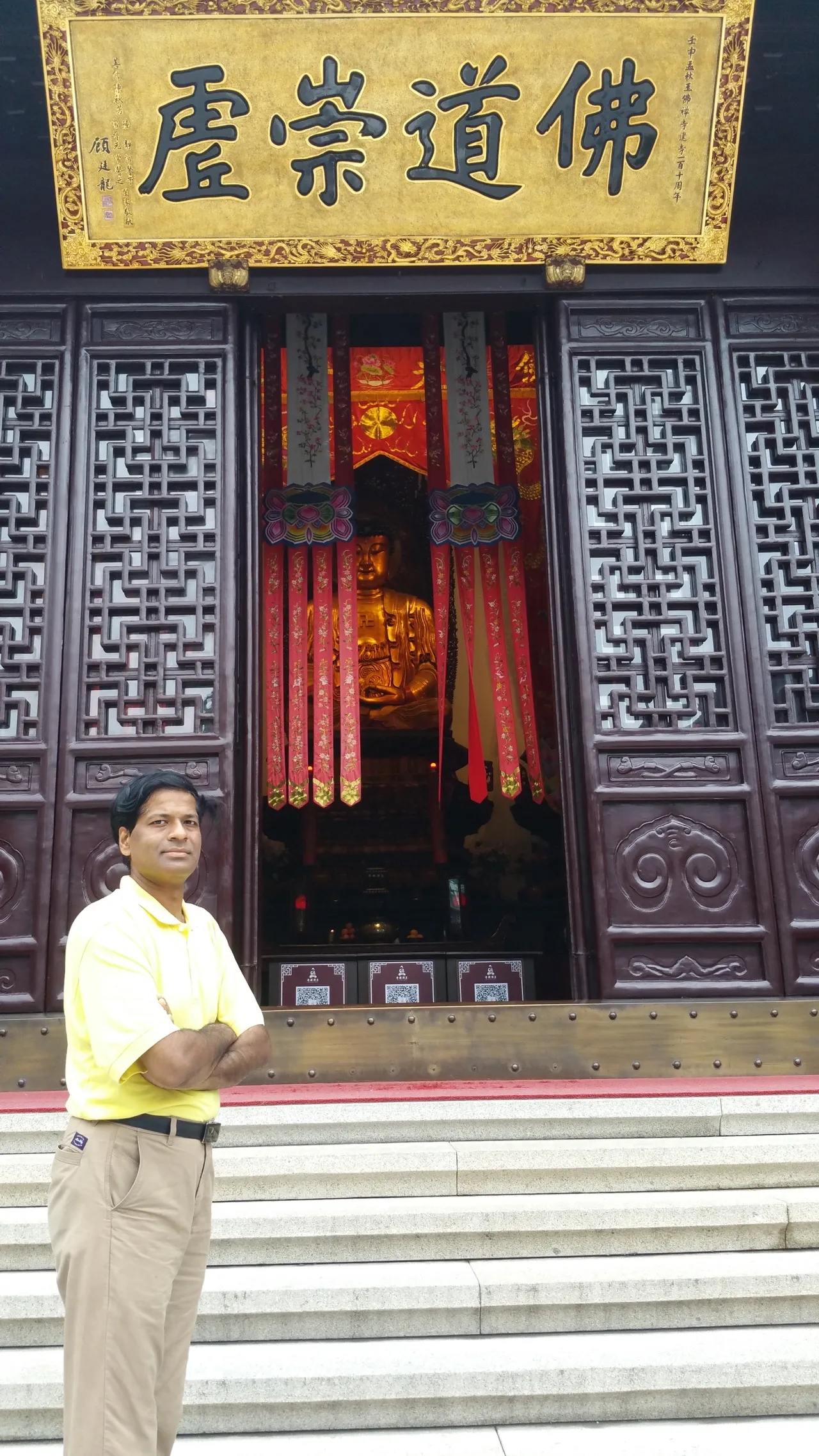 - On the pair of plaques on the pillars in the The Hall of the Holy Triad, it reads that the east and west is one dharma world, unrestrained is the Buddha, and the second line is that here and there is not binary, the ignorance and enlightenment depends on one’s heart